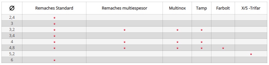 La remachadora RAC 182 permite colocar remaches de diametro de 2,4mm, 3mm, 3,2mm, 4,0mm, 4,8mm, 5,0mm todos los materiales incluidos remaches de acero, acero inoxidable y en diametro 6mm solo remaches standar de aluminio.