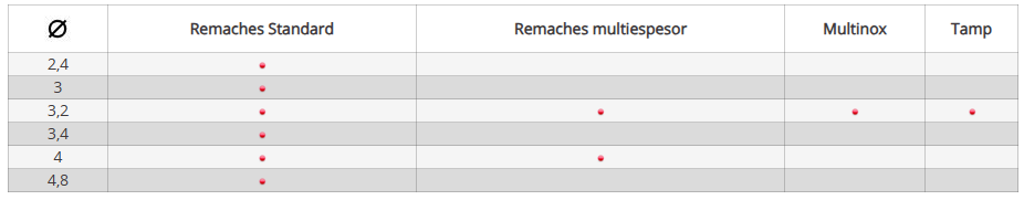 La remachadora RAC 83/95 permite colocar remaches de diametro de 2,4mm, 3mm, 3,2mm, 4,0mm, en todos los materiales incluidos remaches de acero, acero inoxidable y en diametro 4,8 mm solo remaches standar de aluminio.
