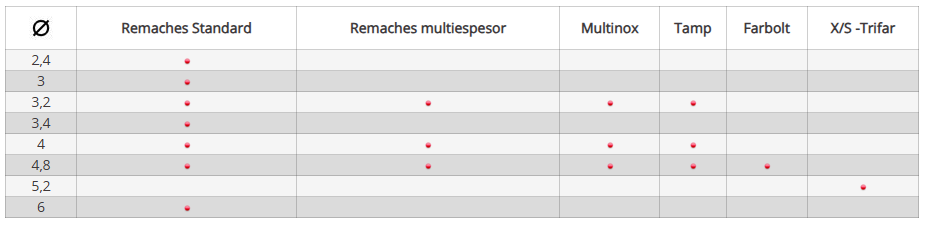 La remachadora RAC 2200 permite colocar remaches de diametro de 2,4mm, 3mm, 3,2mm, 4,0mm, 4,8mm, 5,0mm todos los materiales incluidos remaches de acero, acero inoxidable y en diametro 6mm solo remaches standar de aluminio.